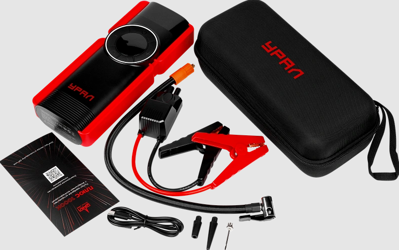 Оснащено аккумулятором высокой емкости, способным выдавать достаточный ток для запуска двигателей транспортных средств, включая легковые автомобили, грузовики и мотоциклы. Встроенный компрессор (10000mAh)