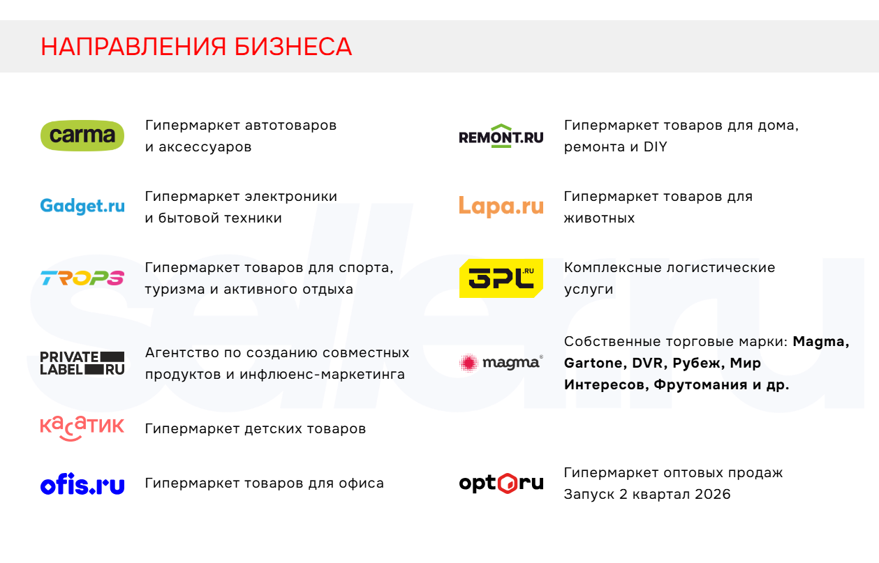 — группа компаний с многопрофильной экосистемой, объединяющая специализированные гипермаркеты, IT и интеллектуальные разработки, а также складскую инфраструктуру.
